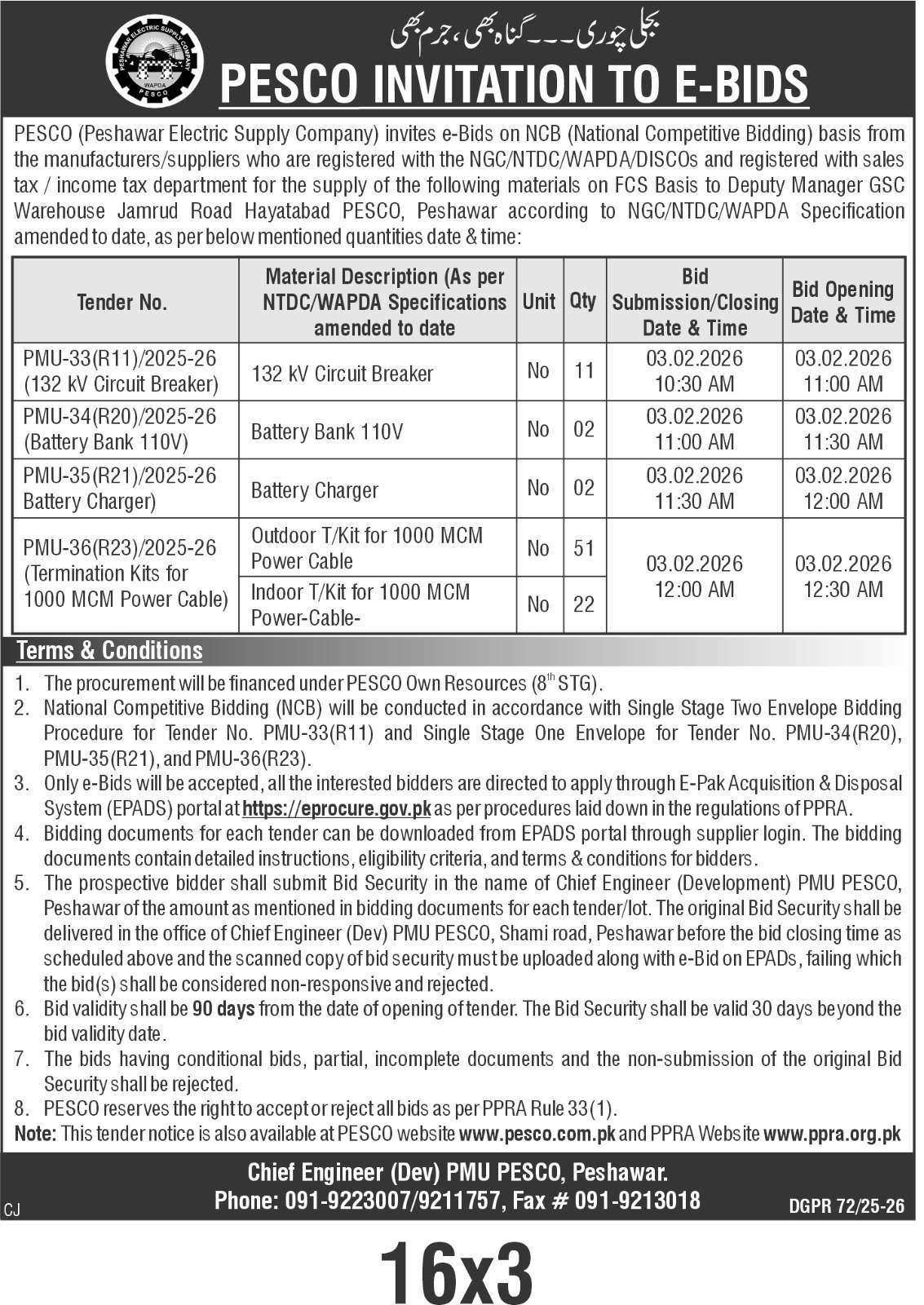 The submission deadline is on 3rd February 2026, with bid opening starting at 10:30 AM for circuit breakers and continuing until 12:30 PM for termination kits. Bids must be submitted online via the E-Pak Acquisition & Disposal System (EPADS) portal. The physical office for bid security submission is the Chief Engineer (Development) PMU PESCO office on Shami Road, Peshawar.