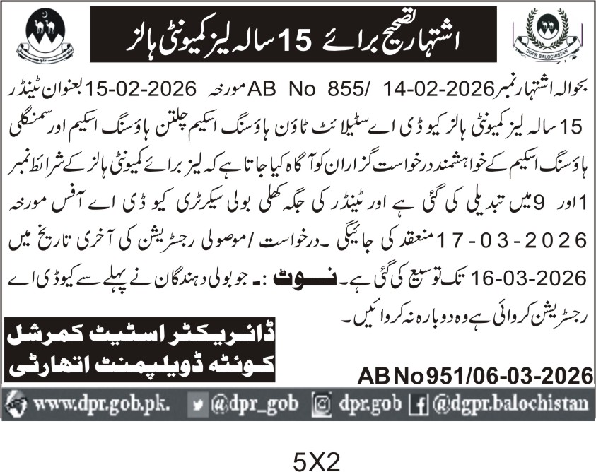 This tender notice from Quetta Development Authority invites bids for a 15-year lease of community halls located in Steel Town Housing Scheme and Sangi Housing Scheme in Quetta. The department requires interested parties to submit applications for leasing these halls, which are key community assets in the city. The lease terms include specific conditions and the tender process involves a security deposit and official registration.