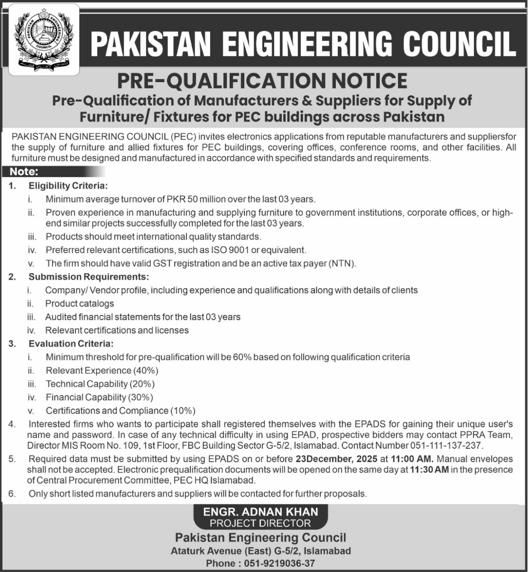 Pre-Qualification of Manufacturers & Suppliers for Supply of Furniture and Fixtures for PEC Buildings across Pakistan