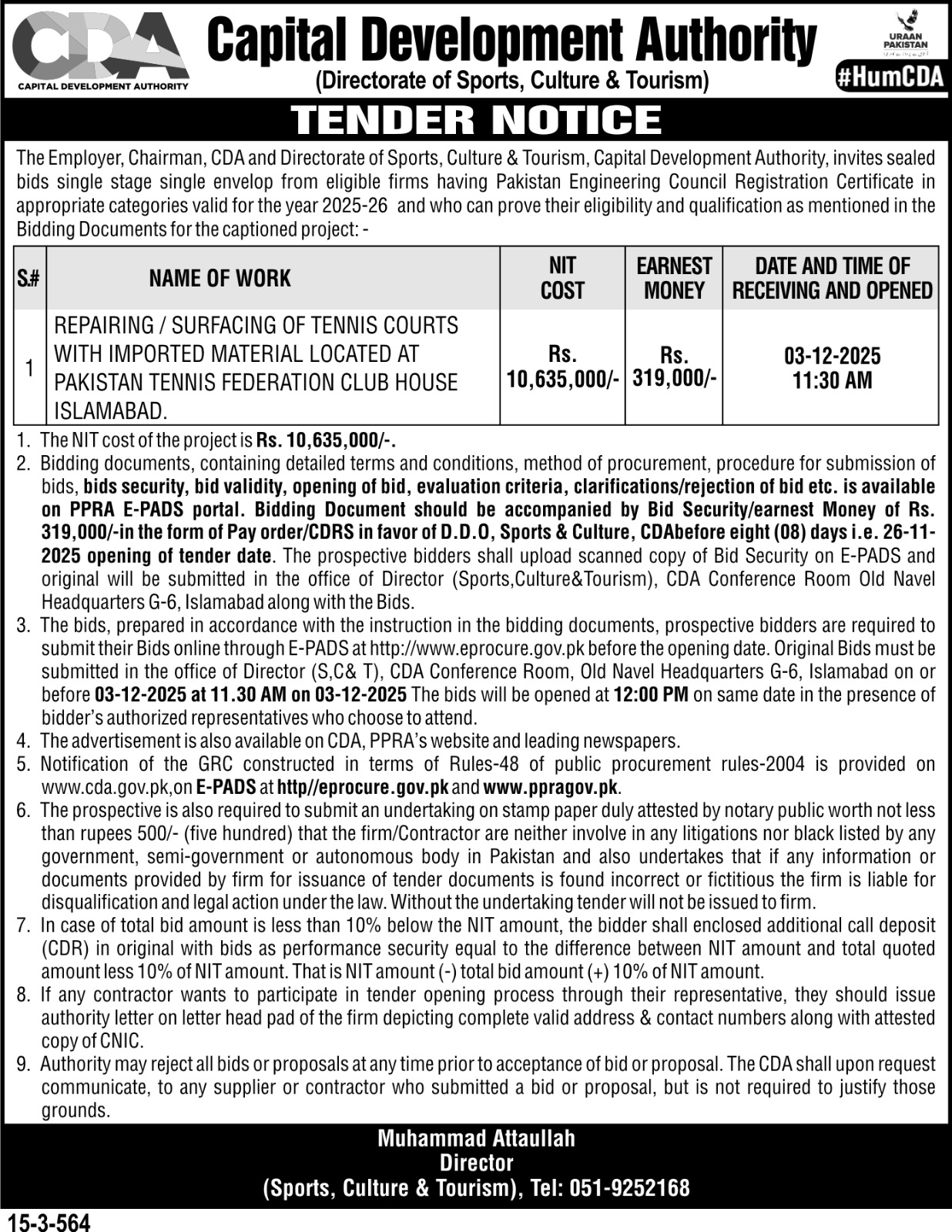 ποΈ Issuing Authority:Capital Development Authority (CDA), Directorate of Sports, Culture & Tourism