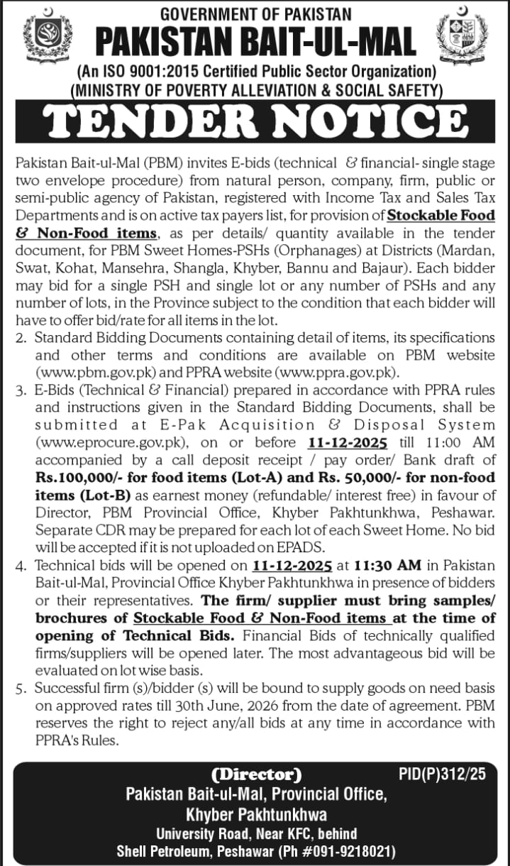 Pakistan Bait-ul-Mal (PBM) invites e-bids from registered natural persons, companies, firms, public or semi-public agencies of Pakistan for the provision of stockable food and non-food items. These items are intended for PBM Sweet Homes-PSHs (Orphanages) located in various districts of Khyber Pakhtunkhwa including Mardan, Swat, Kohat, Mansehra, Shangla, Khyber, Bannu, and Bajaur.