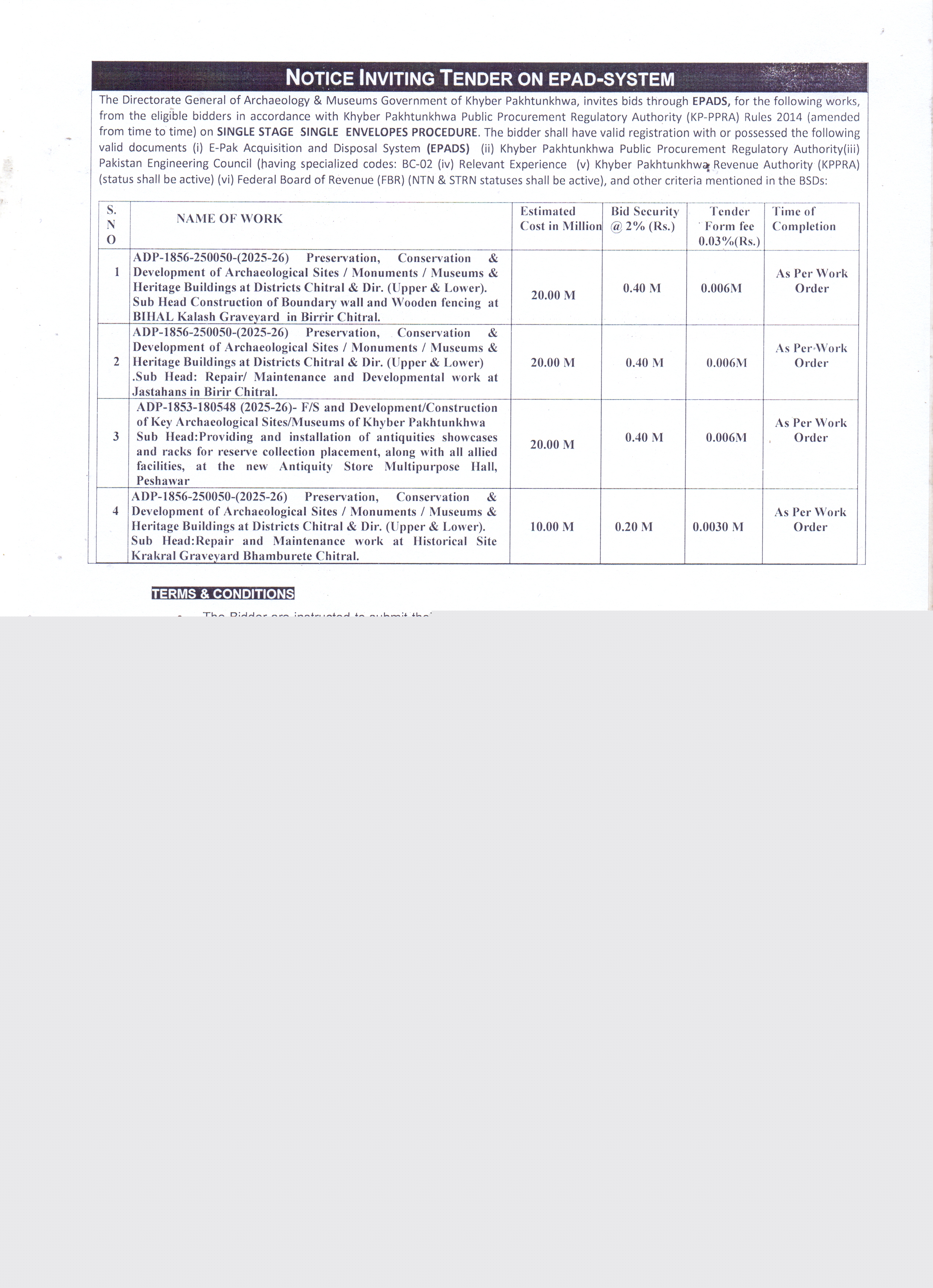 This tender invites bids for the preservation, conservation, and development of archaeological sites, monuments, museums, and heritage buildings in the districts of Chitral and Birir. The scope includes construction of boundary walls, wooden fencing, repair and maintenance works, and installation of antiquities showcases and racks for reserve collection placement.