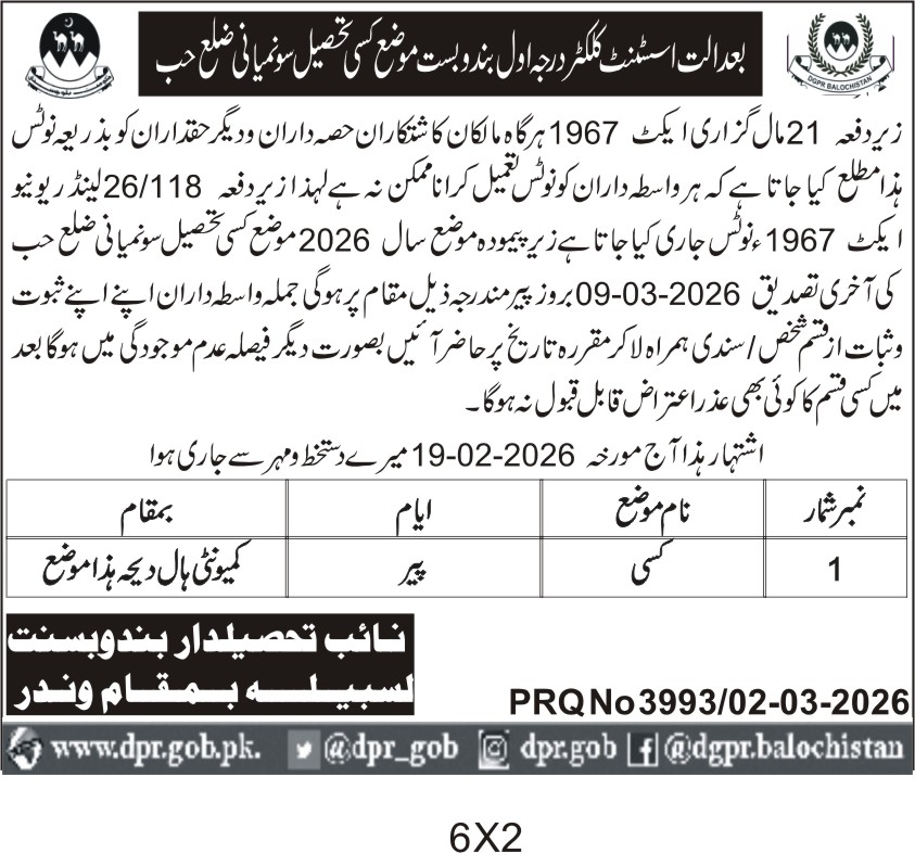 ποΈ Issuing Authority:Deputy Commissioner Balochistan, District Hub