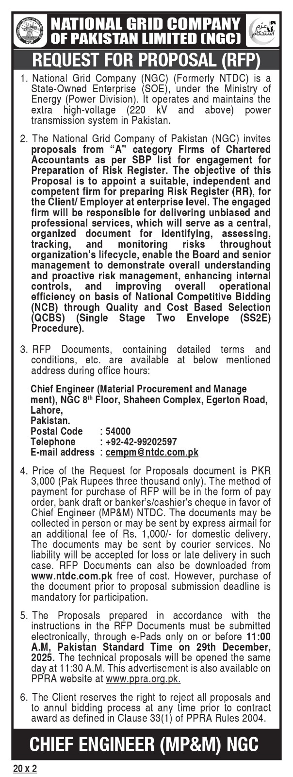 The National Grid Company of Pakistan (NGC) invites proposals from "A" category firms of Chartered Accountants as per SBP list for engagement to prepare a Risk Register. The appointed firm will provide independent and professional services to deliver an unbiased document for identifying, assessing, tracking, and monitoring risks throughout the organization's lifecycle.