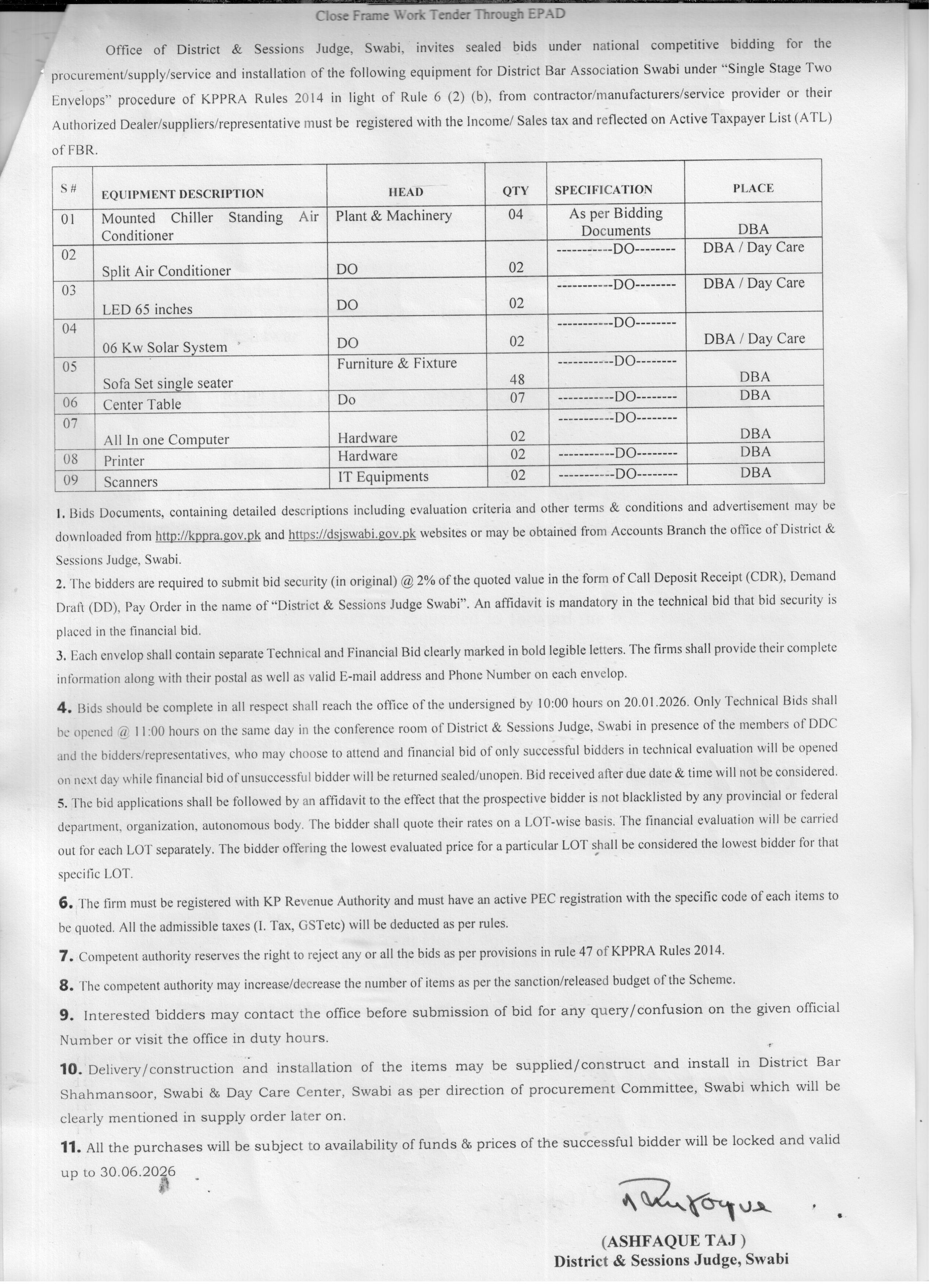 Procurement and Installation of Air Conditioners, Solar System, Furniture, Computers, Printers, and Scanners for District Bar Association Swabi