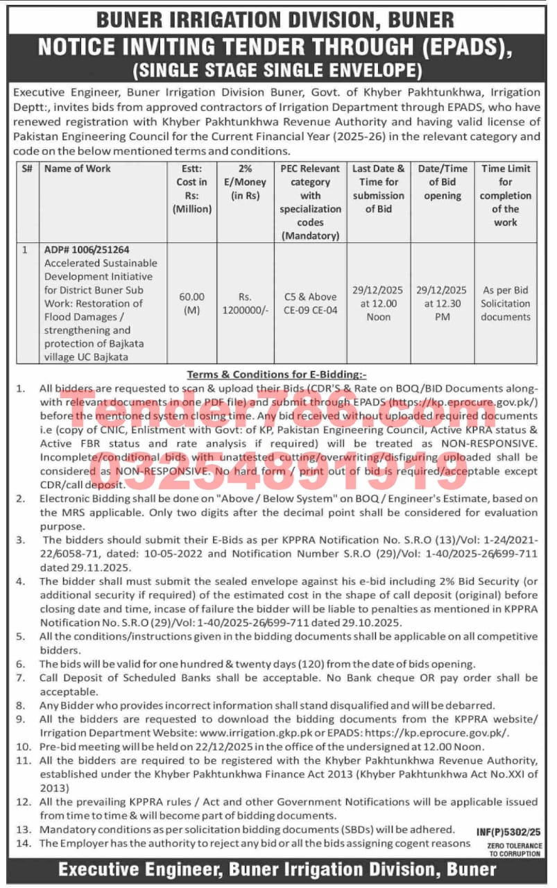 The tender invites bids for the restoration of flood damages and strengthening the protection of Bajkata village in UC Bajkata, District Buner. The project is part of the Accelerated Sustainable Development Initiative for District Buner Sub.