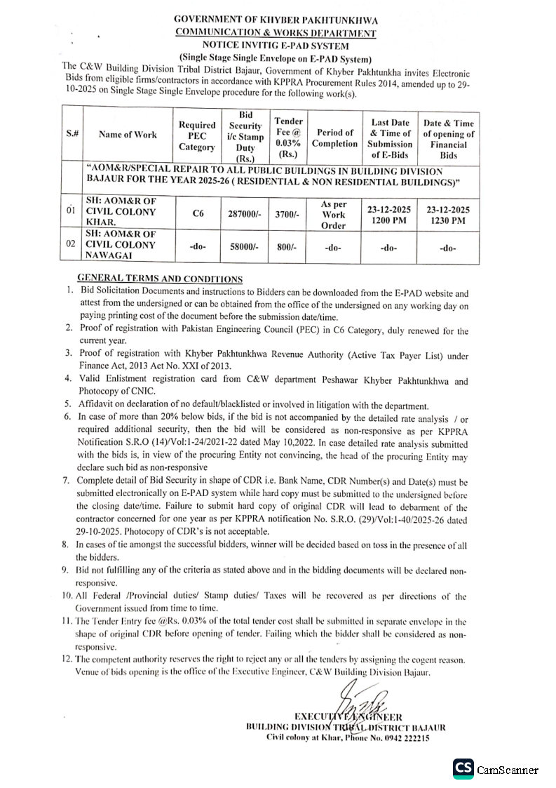 ποΈ Issuing Authority:Communication & Works Department, Building Division Tribal District Bajaur