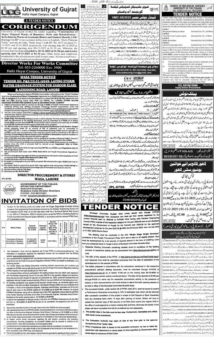 The University of Gujrat invites bids for the construction of major original works including boundary walls and rehabilitation and refurbishing of academic blocks and student hostels. The project is divided into two national dailies with specific dates for bidding and opening.