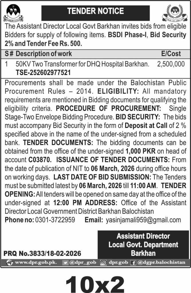 This tender invites bids for the supply of two 50KV transformers intended for the DHQ Hospital in Barkhan, Balochistan. The Local Government Department Barkhan is overseeing this procurement under the Balochistan Public Procurement Rules 2014, ensuring compliance with local regulations and standards.
