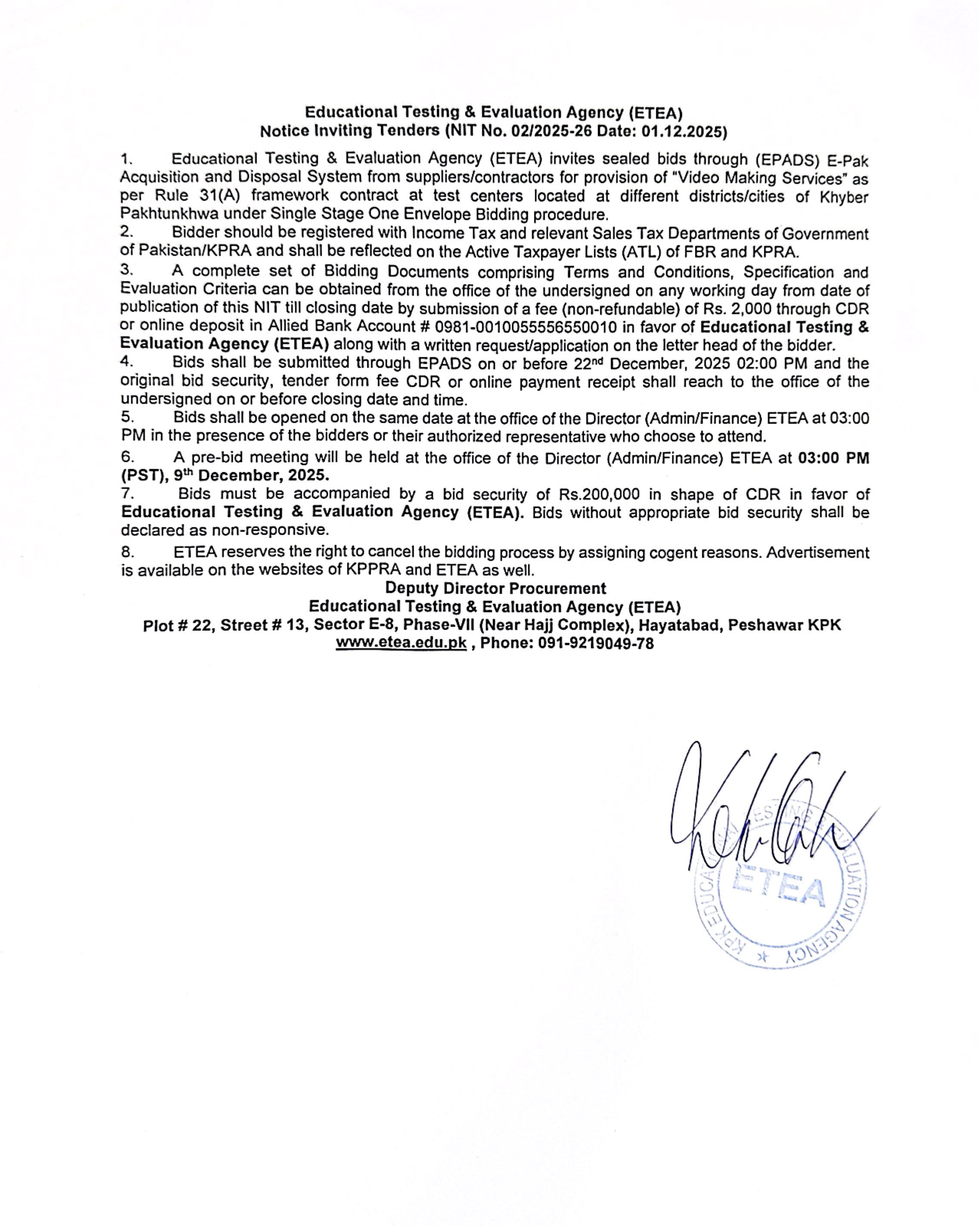 The Educational Testing & Evaluation Agency (ETEA) invites sealed bids from suppliers and contractors for the provision of video making services at test centers located in various districts and cities of Khyber Pakhtunkhwa. The contract will be governed under Rule 31(A) framework and will follow a single stage one envelope bidding procedure.
