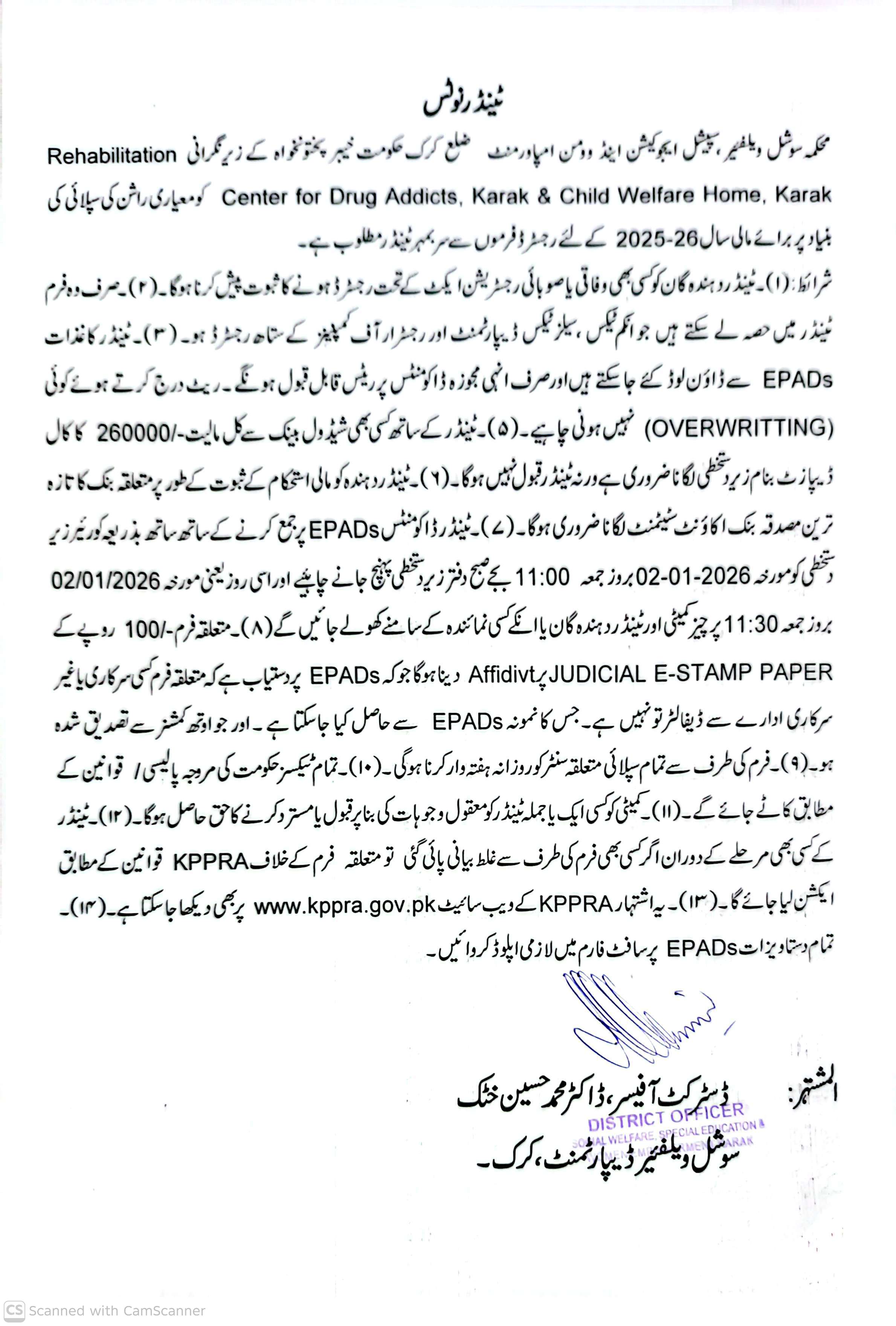Bidders must submit their bids along with a judicial e-stamp paper affidavit and a bank guarantee. The tender documents are available for Rs. 100 and must be submitted by 11:00 AM on January 2, 2026, with the opening of bids at 11:30 AM the same day. Compliance with all government rules and KPPRA regulations is mandatory.