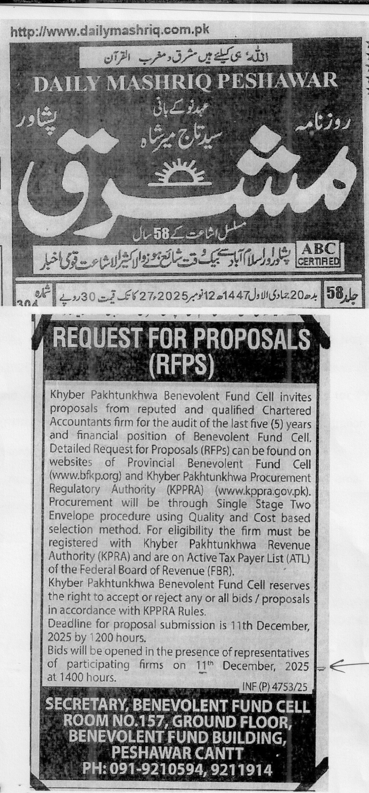 Khyber Pakhtunkhwa Benevolent Fund Cell invites proposals from reputed and qualified Chartered Accountants firms for auditing the financial position of the Benevolent Fund Cell for the last five years. The audit aims to ensure transparency and accuracy in financial reporting.