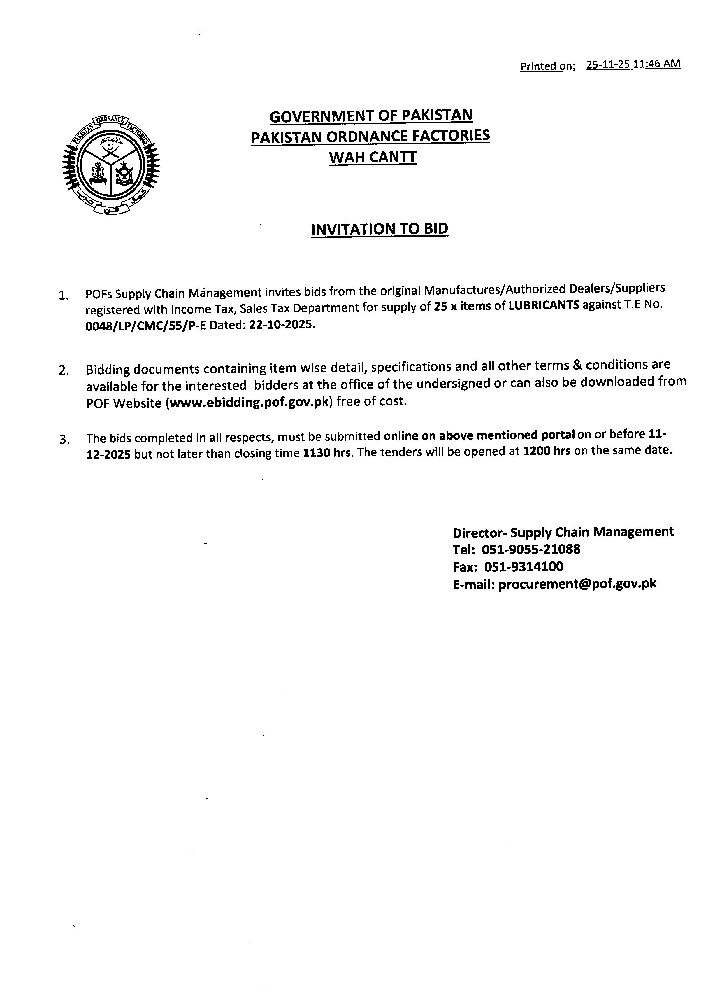 Pakistan Ordnance Factories (POFs) Supply Chain Management invites bids from original manufacturers, authorized dealers, and suppliers registered with Income Tax and Sales Tax Departments for the supply of 25 items of lubricants. The procurement aims to fulfill the lubricant requirements for POFs as per the specified tender number and date.