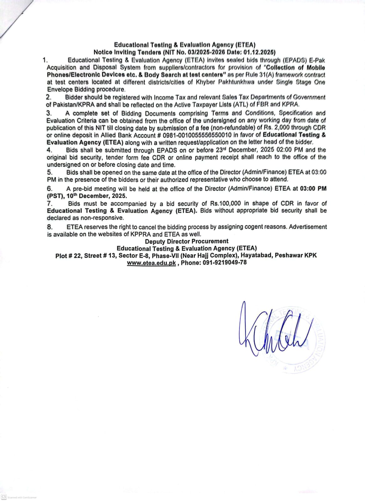 The Educational Testing & Evaluation Agency (ETEA) invites sealed bids for the provision of collection services for mobile phones, electronic devices, and body search at test centers. The contract covers multiple test centers located across various districts and cities in Khyber Pakhtunkhwa.