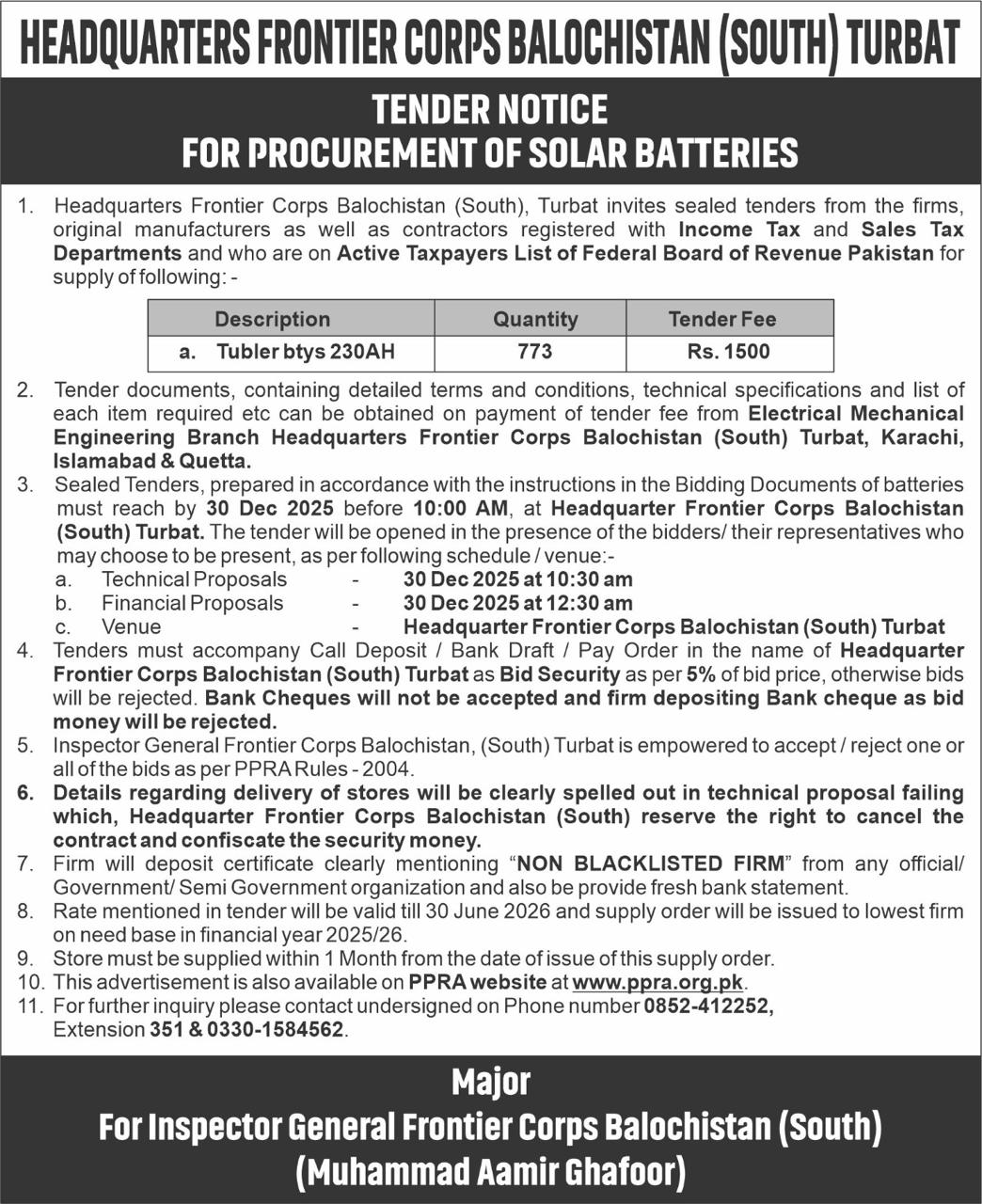This tender invites sealed bids for the supply of 773 solar batteries of 230AH capacity. The procurement is intended to support the electrical and mechanical engineering needs of Frontier Corps Balochistan (South) in Turbat.
