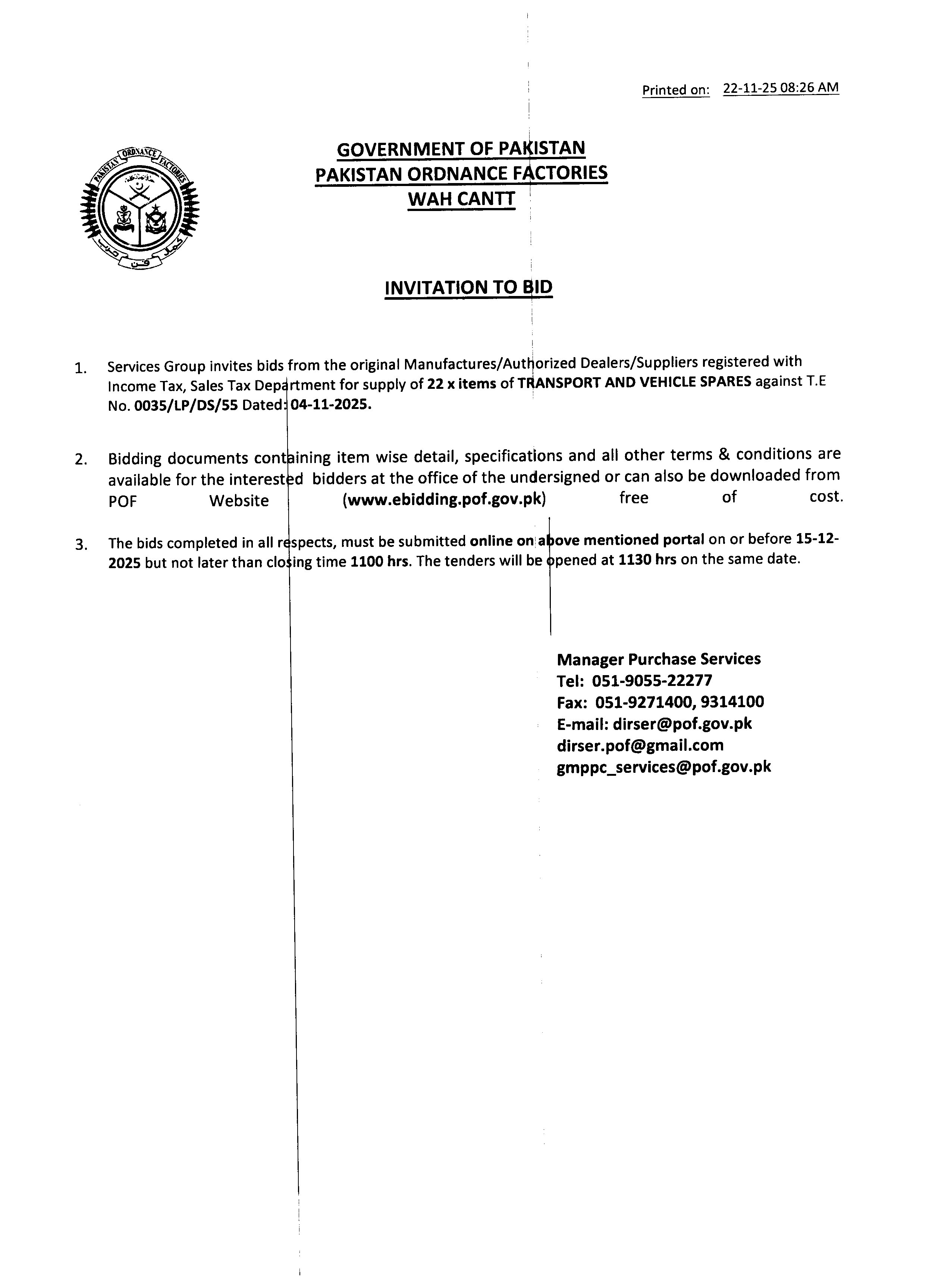 This tender invites bids from original manufacturers, authorized dealers, and suppliers registered with Income Tax and Sales Tax Departments for the supply of 22 items related to transport and vehicle spares. The procurement aims to fulfill the operational requirements of the Pakistan Ordnance Factories at Wah Cantt.