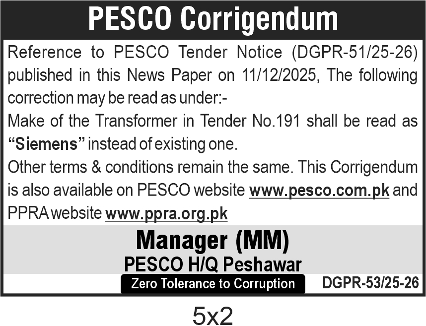 The corrigendum is issued by PESCO Headquarters in Peshawar and is available on the official PESCO and PPRA websites for reference. This update ensures clarity on the specified transformer make for procurement purposes.