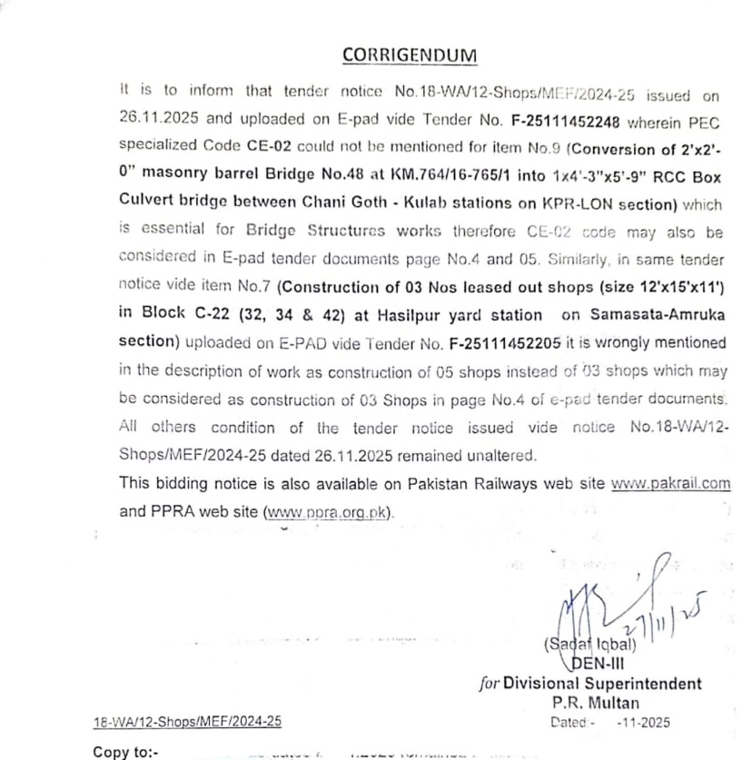 This corrigendum clarifies the tender notice related to the conversion of a masonry barrel bridge into an RCC box culvert bridge between Chani Goth and Kutab stations on the KPR-LON section. The work is essential for bridge structure improvements and includes the conversion of the bridge at KM.764/16-765/1.