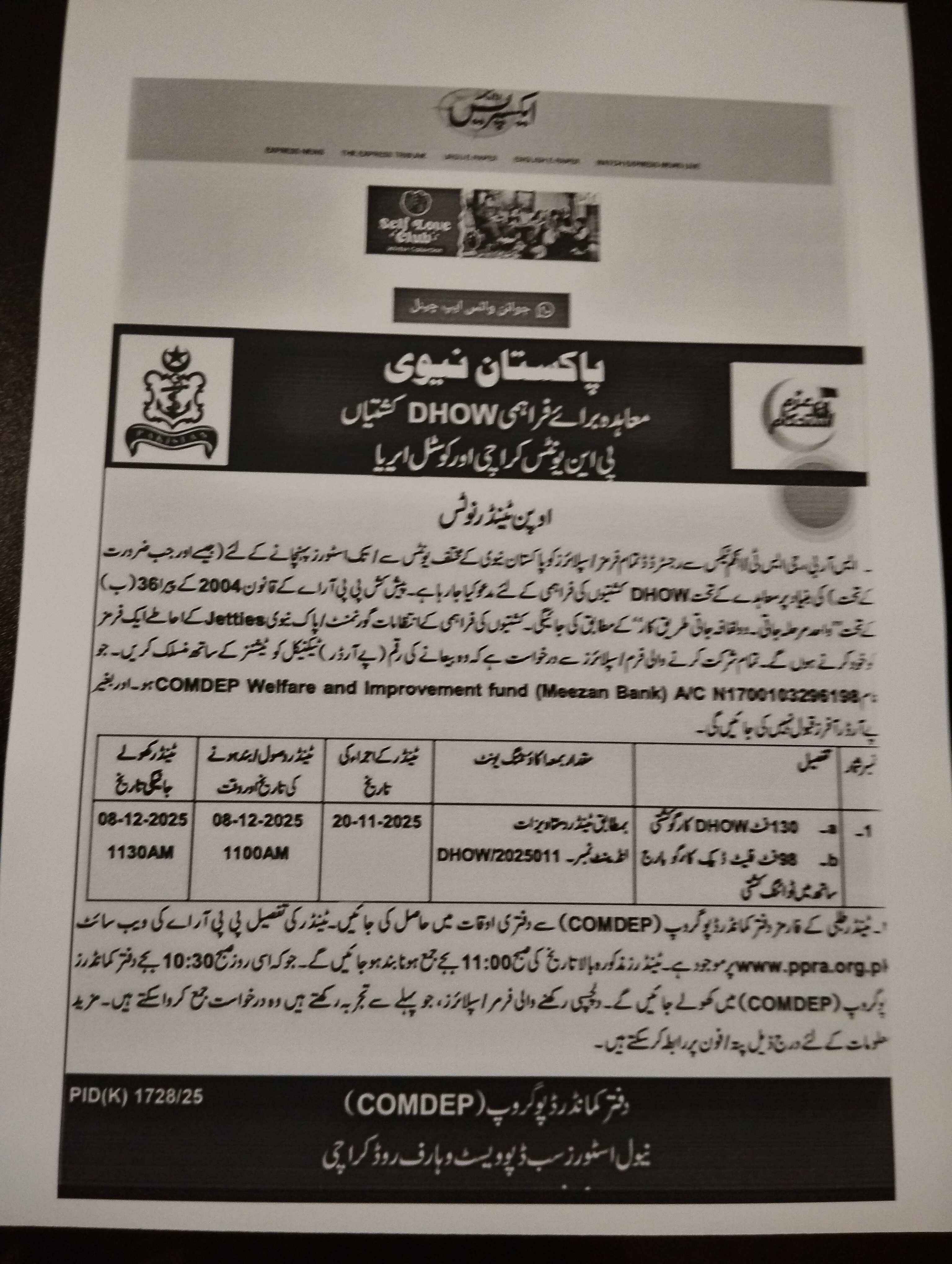 The procurement process is managed by the COMDEP Welfare and Improvement Fund, with bids to be submitted by the specified closing date. The tender aims to enhance the fleet capabilities of the Pakistan Navy through acquisition of these vessels.