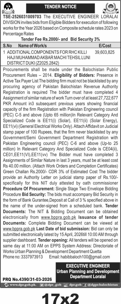 The bid submission deadline is **15 April 2026 at 10:00 AM**, with tender opening at **11:00 AM** the same day via the EPPS system. Submit your bid electronically through the supplier dashboard. The physical address for correspondence is the Directorate of Works Urban Planning & Development Department Quetta.