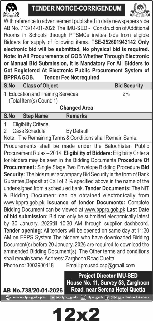 The deadline for electronic bid submission is set for 30 January 2026 at 10:30 AM, with tender opening scheduled the same day at 11:30 AM via the Electronic Public Procurement System (EPPS). Bidders must download the amended bidding documents before 20 January 2026. The physical address for correspondence is House No. 11, Survey 53, Zarghoon Road, near Serena Hotel, Quetta.