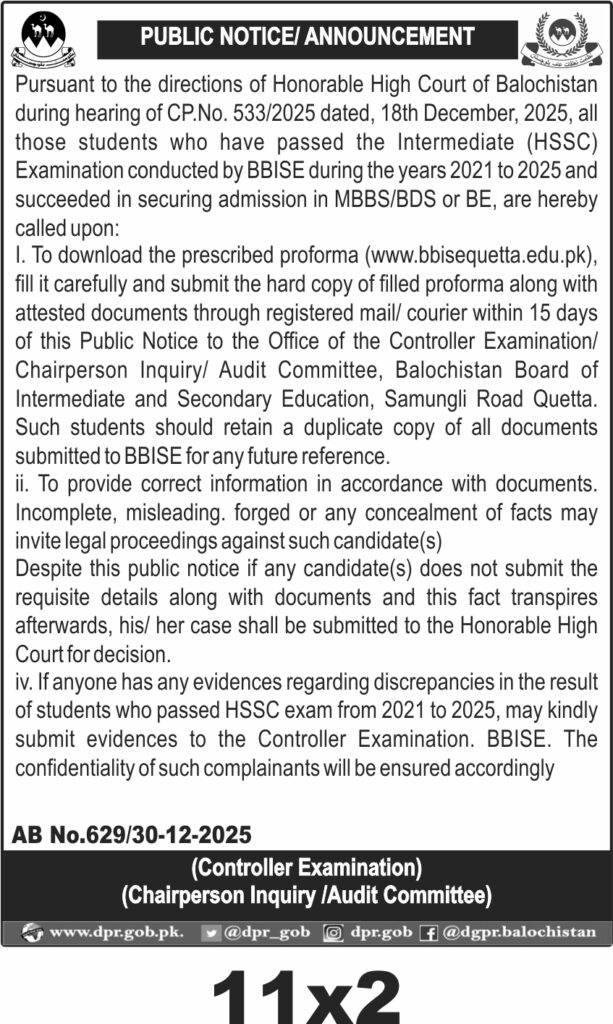 This notice from the Balochistan Board of Intermediate and Secondary Education in Quetta calls upon students who passed the Intermediate (HSSC) Examination from 2021 to 2025 and secured admission in MBBS, BDS, or BE programs to submit their admission documents. The category focuses on education and training documentation compliance.