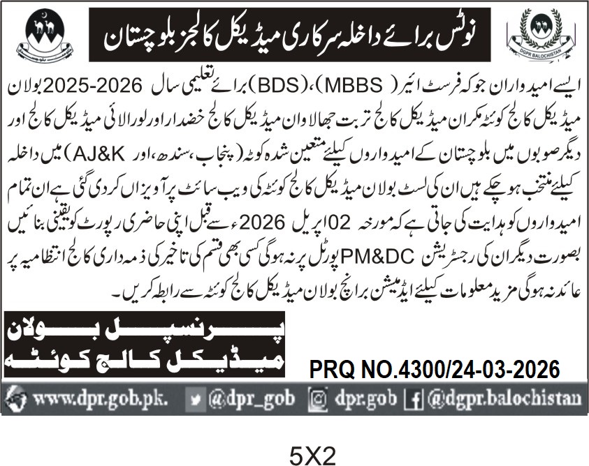 This notice from Balochistan Medical College Quetta invites applications for admission to MBBS and BDS programs for the academic year 2025-2026. The college is accepting candidates from Balochistan and other provinces including Punjab, Sindh, and Azad Jammu & Kashmir (AJ&K). The admission process is competitive and candidates must apply through the official college website.