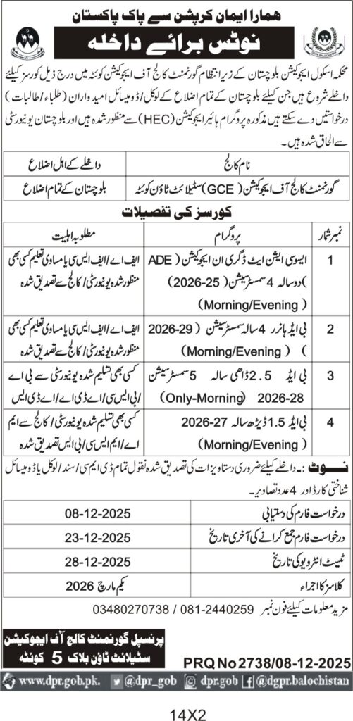 Admissions are open at Government College of Education Satellite Town Quetta for intermediate and diploma programs for the academic year 2025-2026. The tender covers enrollment of students in various education and diploma courses in Quetta under the education category. The programs include ADE, B.Ed, and other diplomas with morning and evening sessions available.