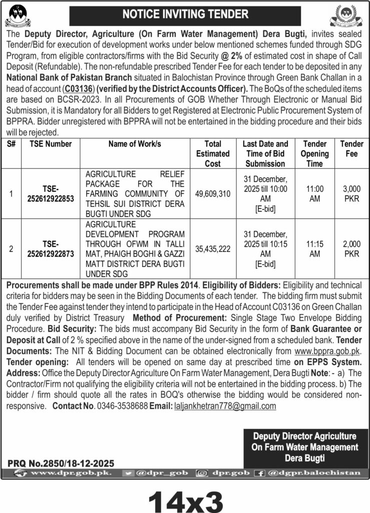 The first scheme focuses on agriculture relief packages for the farming community of Tehsil Sui, while the second covers agriculture development through On Farm Water Management in Talli Mat, Phaigh Boghi, and Gazzi Matt areas. Both projects are funded under SDG and require eligible contractors to submit bids electronically.