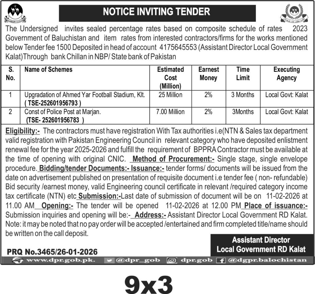 This tender invites contractors in Kalat, Balochistan, through the Local Government RD Kalat for construction and upgradation works under the Construction & Civil Works Materials category. The projects include the upgradation of Ahmed Yar Football Stadium and the construction of a Police Post at Marjan. Both projects require experienced contractors familiar with local construction standards and capable of delivering quality work within the stipulated time frame.