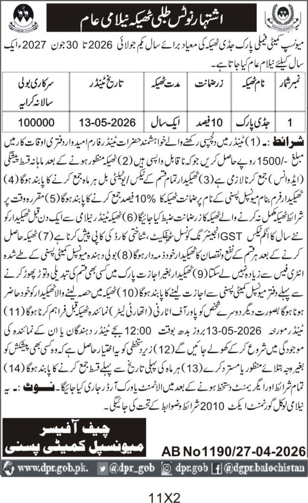 The Municipal Committee Pishin invites bids for the annual maintenance of the Municipal Park Jatti Thal for the fiscal year 2026-2027. This tender covers comprehensive upkeep and maintenance of the park, including horticultural care, landscaping, and general civil works to ensure the park remains in good condition throughout the year.