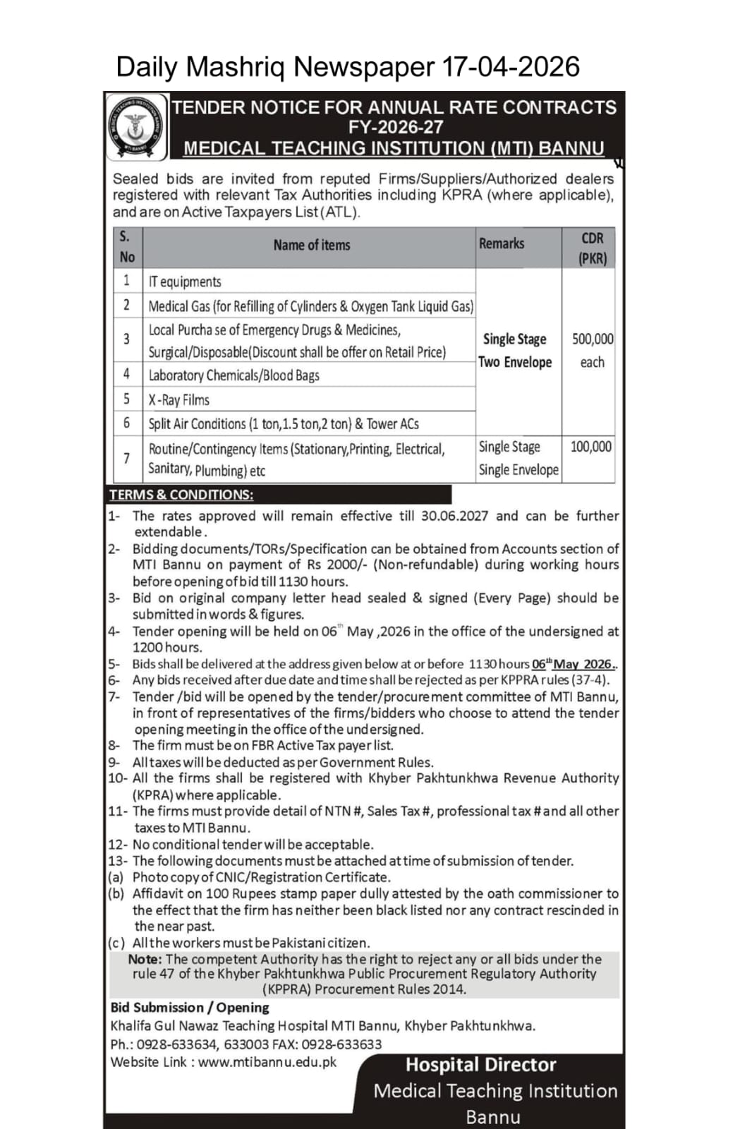 The Medical Teaching Institution (MTI) Bannu is procuring annual rate contracts for the fiscal year 2026-27 covering a wide range of essential items including IT equipment, medical gases such as refilling of cylinders and oxygen tank liquid gas, emergency drugs and medicines, surgical disposables, laboratory chemicals and blood bags, X-ray films, split air conditioners (1 ton, 1.5 ton, 2 ton) and tower ACs, as well as routine and contingency items like stationery, printing, electrical, sanitary, and plumbing supplies. This procurement is specifically for the MTI Bannu located in Khyber Pakhtunkhwa.