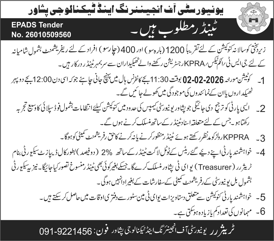 The submission deadline is set for 12:00 PM on 2nd February 2026, with the technical bids opening at 11:30 AM the same day. Interested parties must submit their bids in sealed envelopes to the university's office in Peshawar before the deadline.