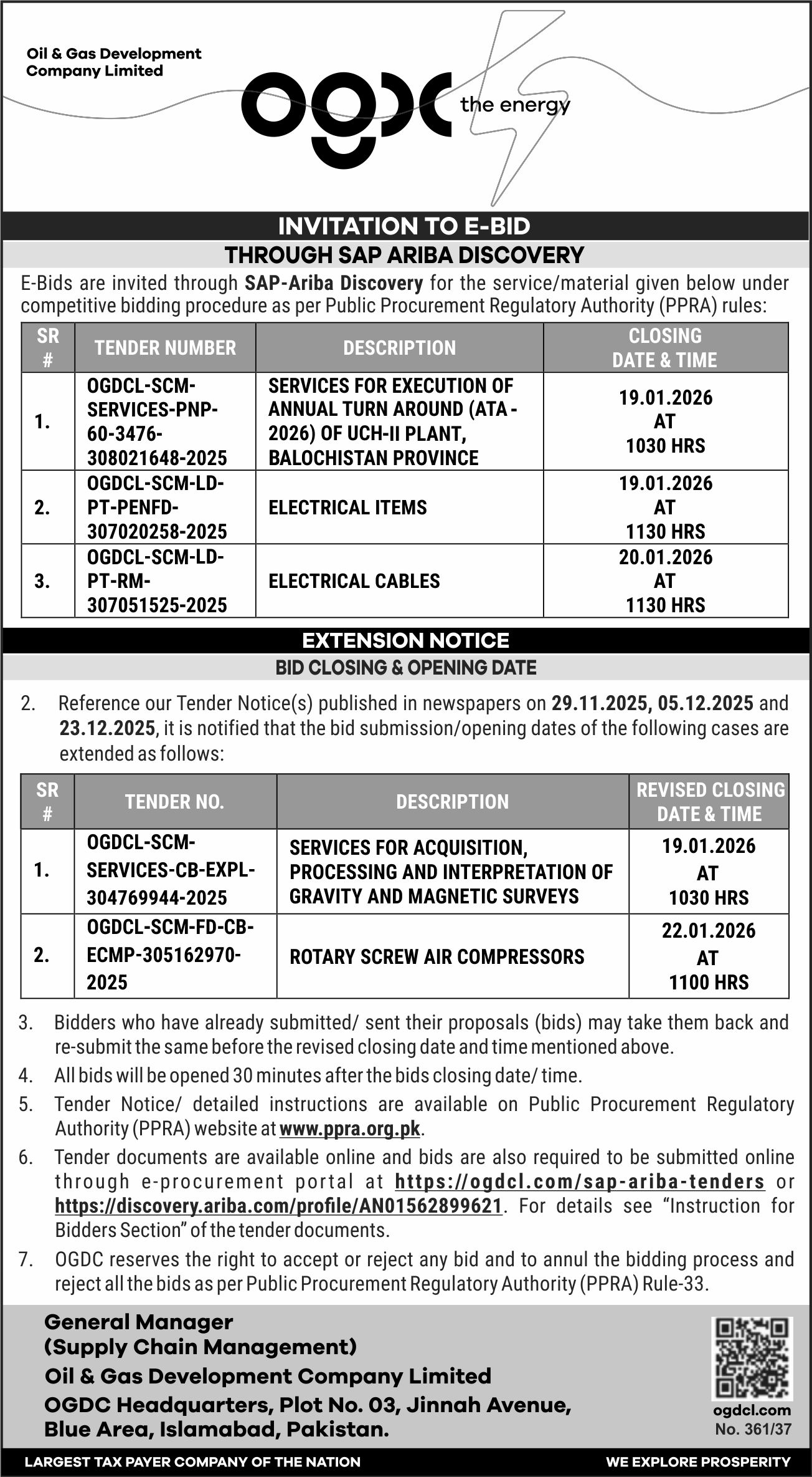 The submission deadline is set for 19 January 2026 at 10:30 AM, with bid opening scheduled 30 minutes later. Bids must be submitted online through the specified e-procurement portal. The physical address for correspondence is OGDC Headquarters, Plot No. 03, Jinnah Avenue, Blue Area, Islamabad.