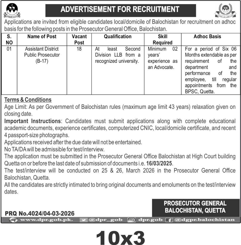 This recruitment notice from the Prosecutor General Office Balochistan in Quetta invites eligible local candidates for the position of Assistant District Public Prosecutor (B-17). The recruitment is on an adhoc basis with 18 vacant posts available, targeting qualified advocates with at least a Second Division LLB from a recognized university and a minimum of two years' experience.