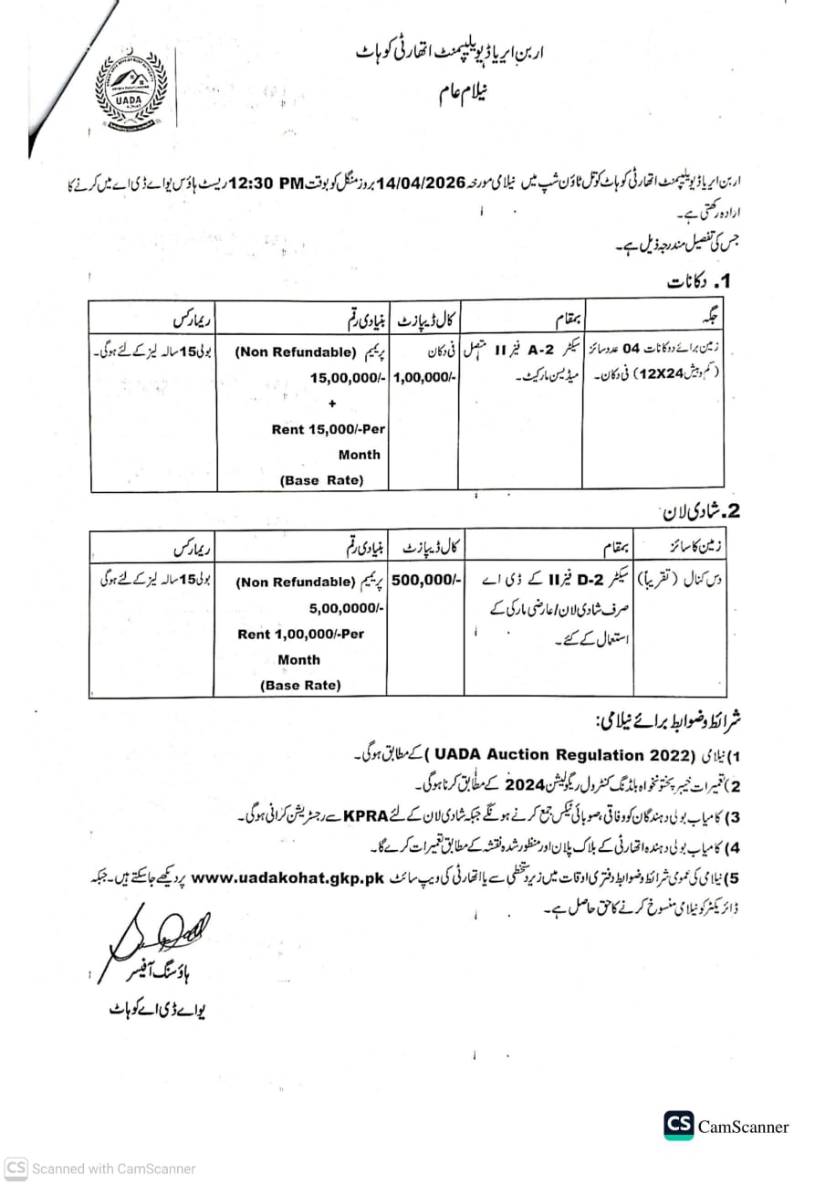 The commercial plot is located in sector A-2, near the main market, while the marriage hall plot is in sector D-2, designated strictly for marriage hall or recreational use. These plots provide excellent opportunities for investors and entrepreneurs looking to establish businesses or event venues in Kohat, a growing city in Khyber Pakhtunkhwa. The auction process follows UADA Auction Regulation 2022 and requires bidders to comply with local tax and registration requirements.