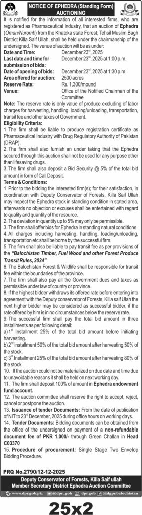 An auction is announced for Ephedra standing form from Khatoka State Forest in Killa Saif Ullah, Balochistan. The procurement involves 2500 acres of Ephedra with a reserve rate of Rs. 1,300 per mound. The auction is scheduled for December 23, 2025, with bids submission and opening on the same day.