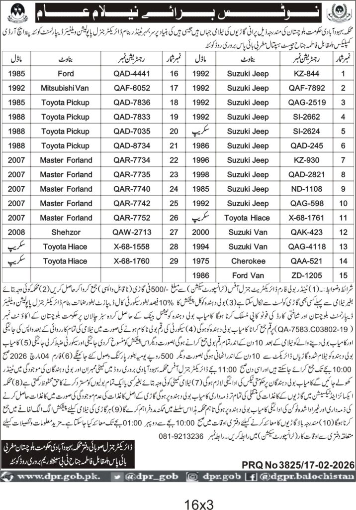 The auction includes a variety of vehicles from different years, such as Suzuki Jeeps from 1985 to 1998, Toyota pickups from the late 1980s, and Master Forland trucks from 2007. Bidders should note the condition and registration details of each vehicle as listed. The vehicles are available for inspection at the department's office in Quetta, allowing bidders to assess their condition before submitting bids.