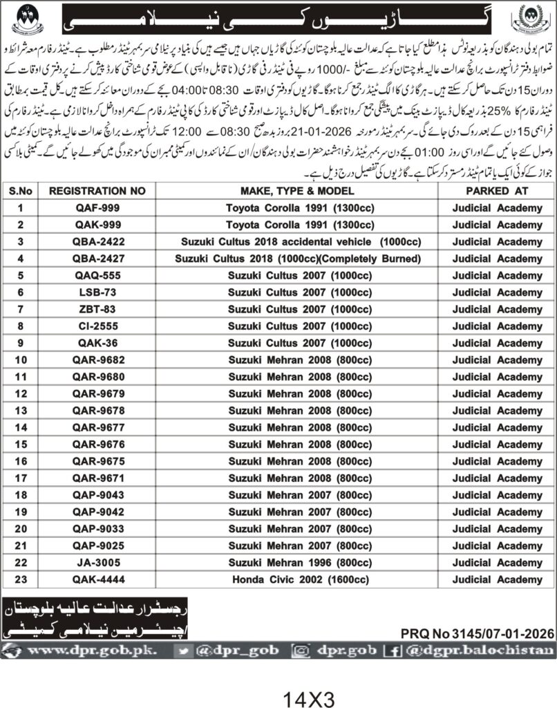 The vehicles are available for inspection during office hours, and the auction will be conducted transparently to ensure fair competition. This opportunity is ideal for buyers looking for used vehicles in Quetta, with clear terms on payment and bid submission. The High Court Balochistan ensures all legal formalities are met, and only registered bidders with valid documentation will be entertained.