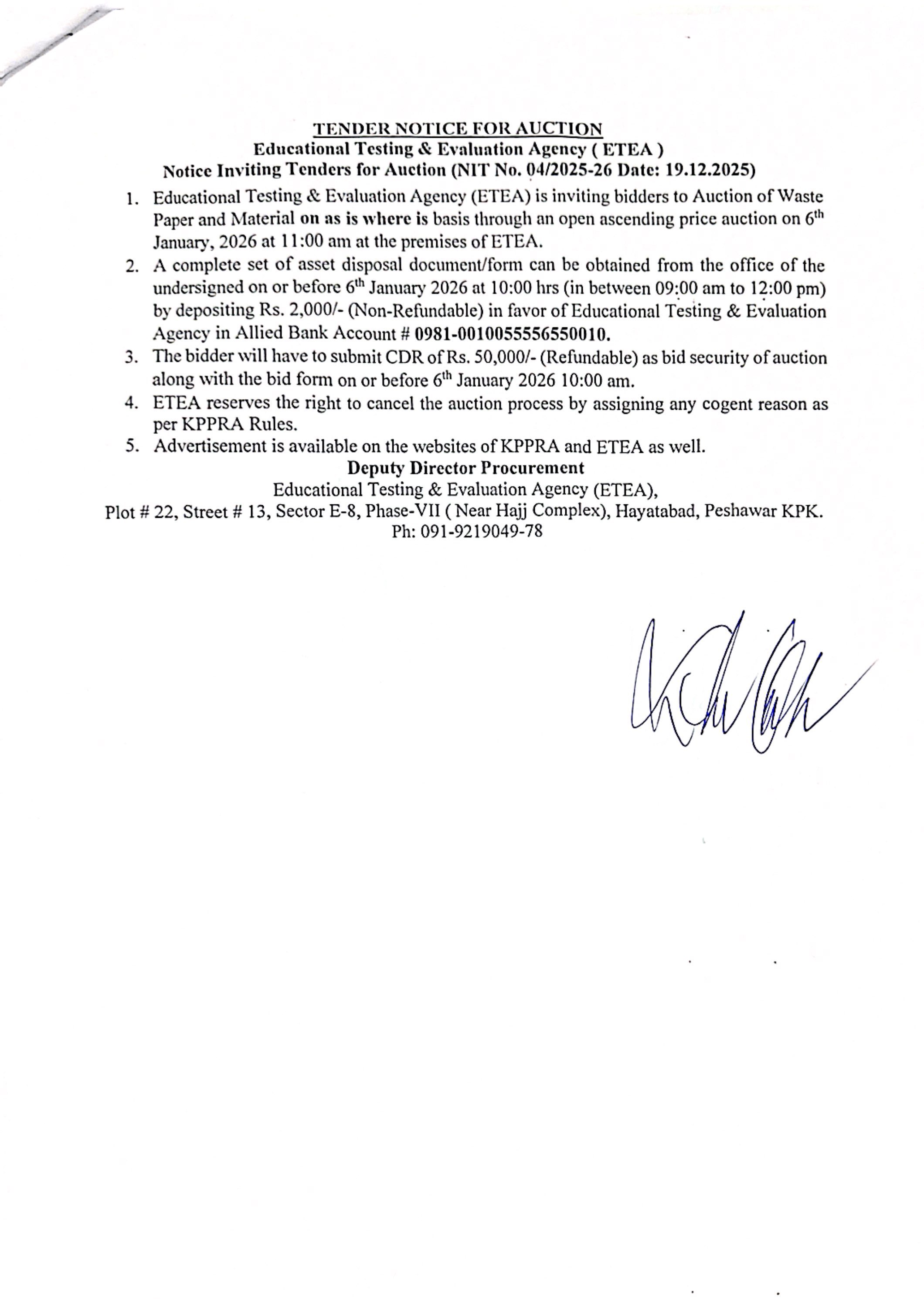Educational Testing and Evaluation Agency (ETEA) invites bidders for an open ascending price auction of waste paper and material on an as-is-where-is basis. The auction will be held on 6th January 2026 at 11:00 am at ETEA premises in Peshawar.