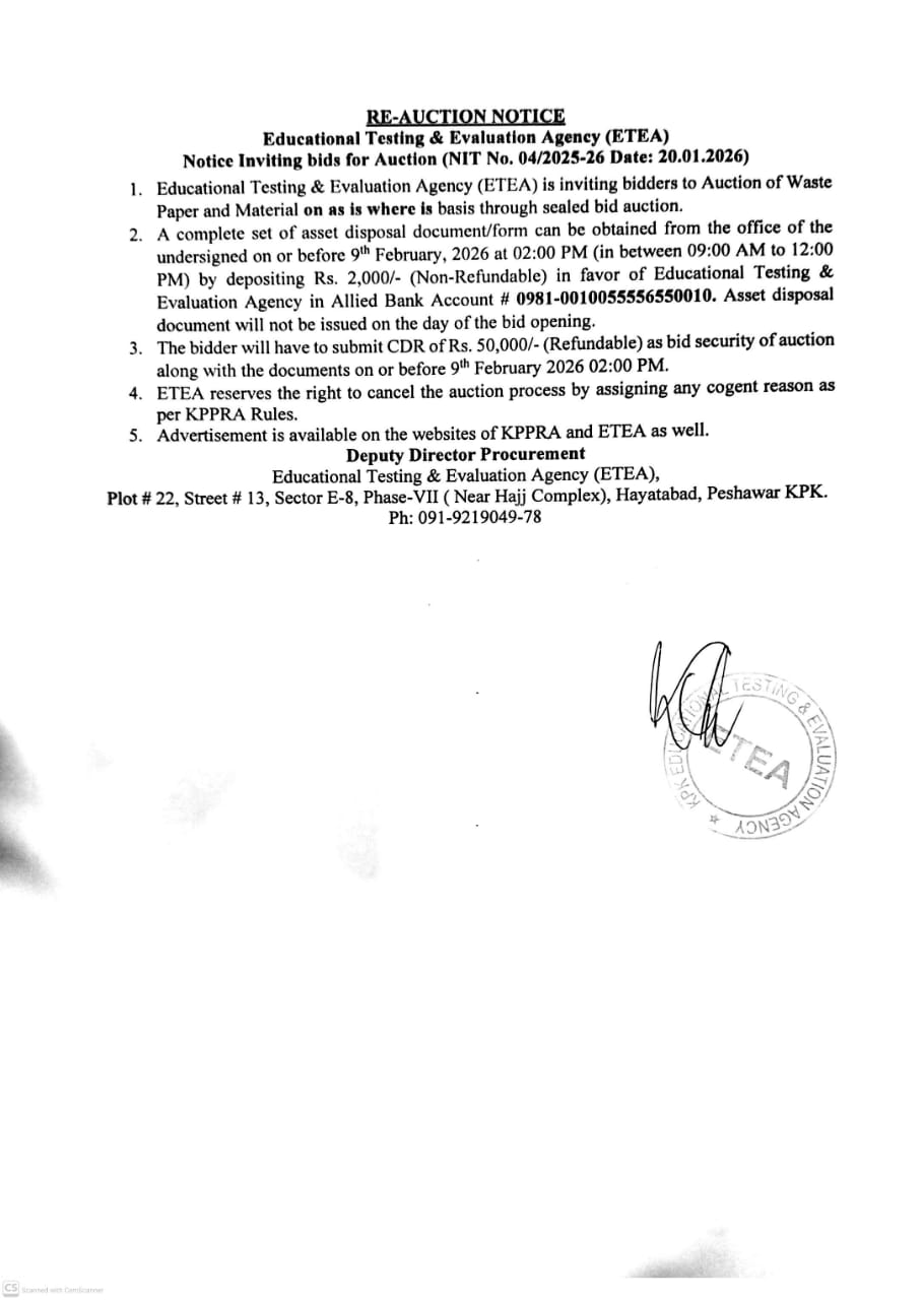 Auction of Waste Paper and Material by Educational Testing & Evaluation Agency Peshawar