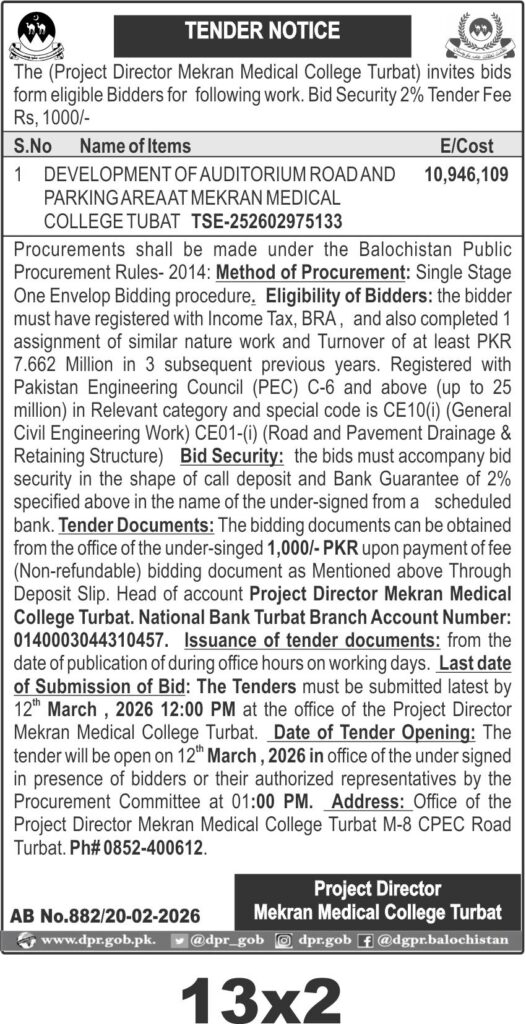 The submission deadline is set for 12th March 2026 at 12:00 PM, with the tender opening scheduled the same day at 1:00 PM. Bids must be submitted physically at the office of the Project Director Mekran Medical College Turbat, located at M-8 CPEC Road, Turbat. Interested parties should ensure their bids include a 2% bid security in the form of a call deposit or bank guarantee.