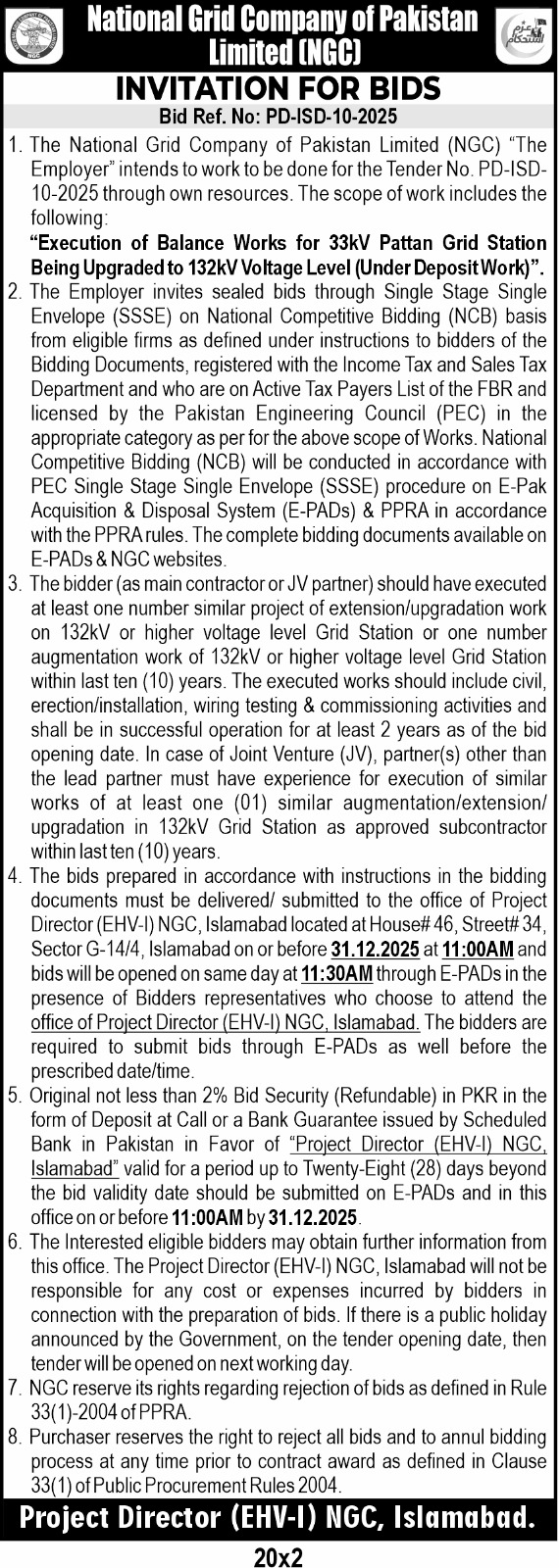 The scope includes civil, erection, installation, wiring testing, and commissioning activities for the grid station upgrade. Eligible bidders must have executed similar projects on 132kV or higher voltage grid stations within the last ten years and demonstrate at least two years of successful operation. Joint ventures are allowed with specific experience requirements. Bids must be delivered to the Project Director (EHV-I) NGC Islamabad office by 31.12.2025 at 11:00AM, with bid opening at 11:30AM the same day. A refundable 2% bid security is required. The process follows PEC and PPRA rules with submission via E-PADs.