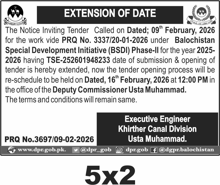 This tender notice concerns the extension of the submission and opening date for the Balochistan Special Development Initiative (BSDI) Phase-II works in Usta Muhammad, Balochistan. The department requires contractors to participate in civil works aimed at regional development under the BSDI program for the fiscal year 2025-2026. The project involves various construction activities that demand quality materials and skilled engineering to meet the local terrain and climatic challenges in Usta Muhammad.