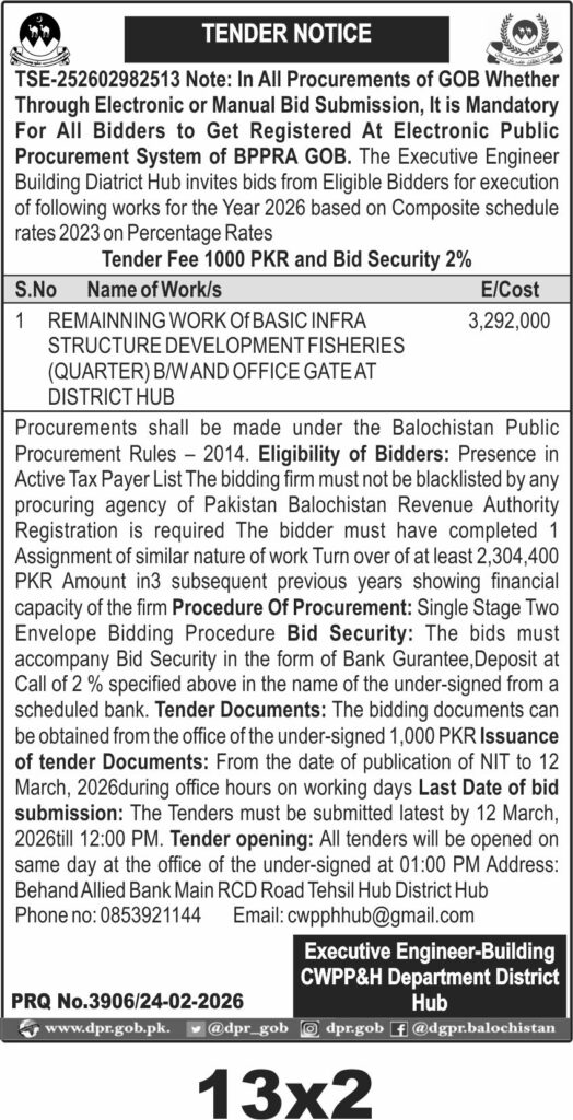 This tender invites bids for the remaining construction work of basic infrastructure development at Fisheries Quarter B/W and the office gate located in District Hub, Balochistan. The Pakistan Water and Power Development Authority (WAPDA), District Hub requires experienced contractors to complete these civil works based on composite schedule rates 2023 on percentage basis.