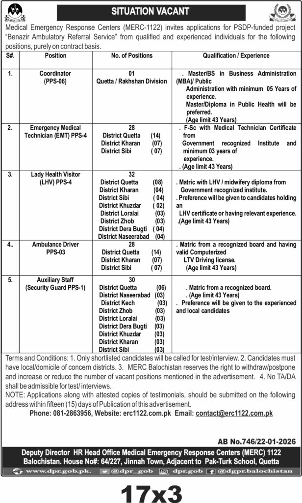This recruitment drive by Medical Emergency Response Centers (MERC) 1122 in Quetta, Balochistan, seeks qualified professionals for the Benazir Ambulatory Referral Service under PSDP funding. The focus is on medical and emergency response roles including coordinators, EMTs, lady health visitors, ambulance drivers, and auxiliary staff.