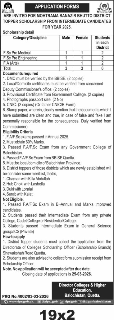 The scholarship aims to support district toppers from government colleges in Balochistan who have passed their F.A/F.Sc exams in 2025 with at least 60% marks. Applicants must be local residents of Balochistan and have their academic and domicile documents verified by the relevant authorities. The application process requires submission of verified DMCs, domicile certificates, provisional certificates, passport-size photographs, CNIC copies, and a stamped declaration of authenticity.