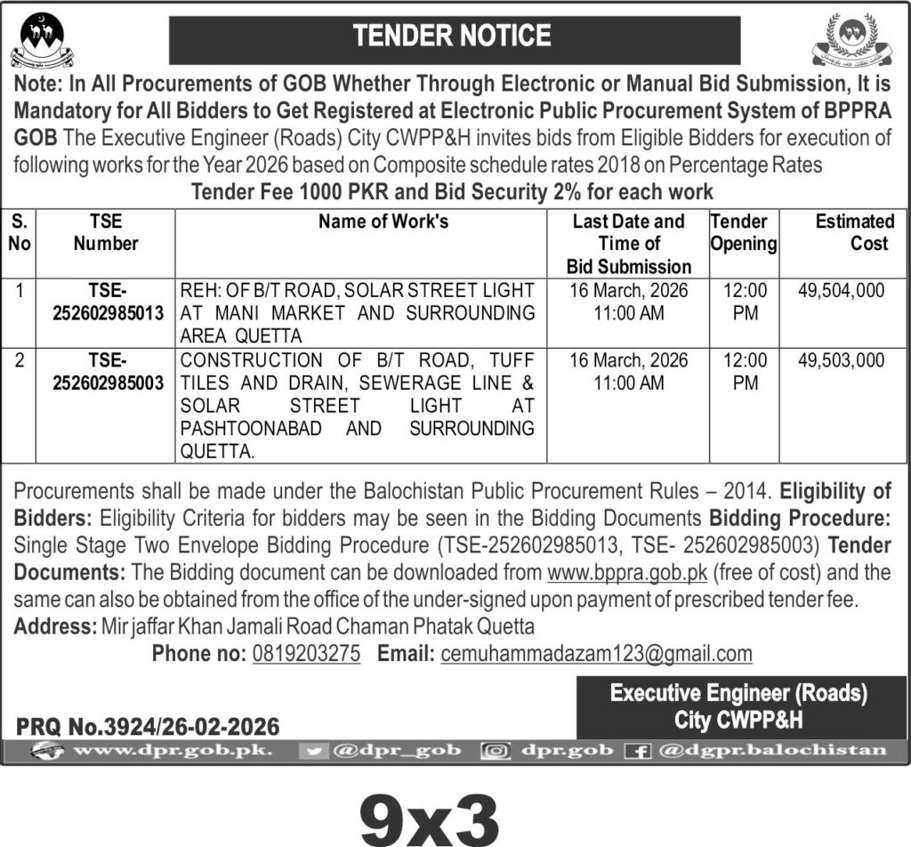 Bidders should ensure compliance with PEC registration and maintain an active FBR ATL status for the fiscal year 2025-26. The tender follows the Balochistan Public Procurement Rules 2014, and bidders must submit a 2% bid security along with a tender fee of PKR 1000. Technical and financial bids will be evaluated under the Single Stage Two Envelope procedure.