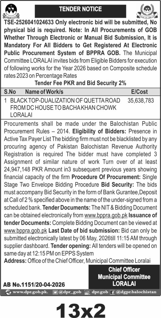 The Municipal Committee Loralai is inviting bids for the black top-dualization of Quetta Road from DC House to Bacha Khan Chowk in Loralai for the financial year 2026. This procurement involves significant road infrastructure work based on composite schedule rates 2023 on percentage rates. The project is a key development initiative aimed at improving the road network in Loralai, enhancing traffic flow and connectivity.