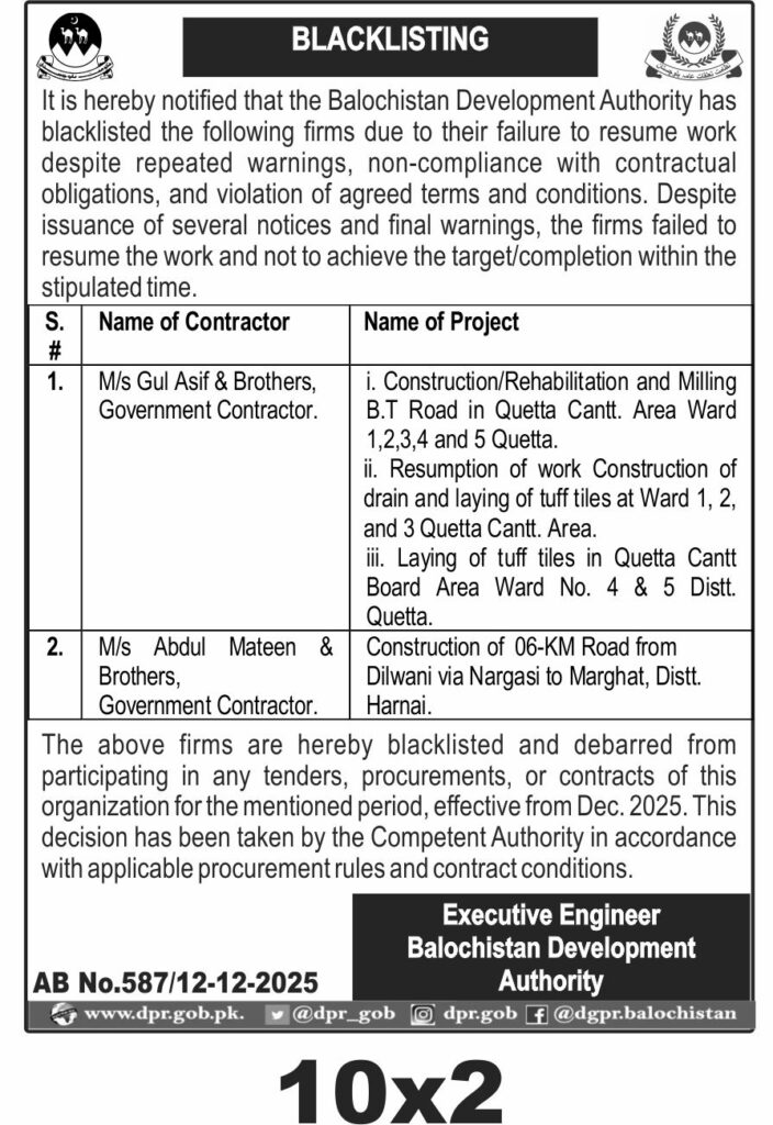 The firms are barred from participating in any tenders or contracts with the authority effective from December 2025. This decision follows procurement rules and contract conditions enforced by the competent authority of the Balochistan Development Authority.